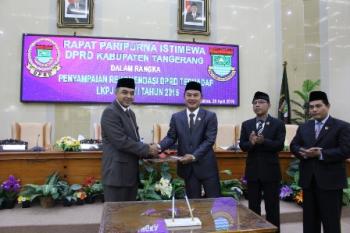 Bupati Tangerang A. Zaki Iskandar mengucapkan terima kasih dan apresiasi yang setinggi-tingginya kepada para pimpinan dan anggota DPRD Kabupaten Tangerang atas kerjasama dan kerja keras serta koordinasi yang telah terjalin selama ini. Terlebih telah disampaikannya rekomendasi DPRD terhadap LKPJ Bupati Tangerang 2015. Hal ini mencerminkan perhatian yang cukup tinggi terhadap penyelenggara pemerintah daerah yang telah dilaksanakan di Tahun 2015.