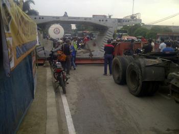 CURUG - Truk tronton mengangkut beton ablas di Jalan Raya serang KM 2, Bitung, Kecamatan Curug, Kabupaten Tangerang. AKibatnya, akses menuju Cikupa maupun Kota Tangerang macet total.