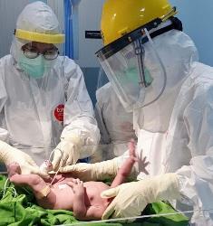TANGERANG, (JT) - Seorang ibu hamil positif coronavirus (COVID-19), Nyonya E.F. melahirkan bayi laki-laki, Selasa (28/4/2020). Proses persalinan ini berlangsung secara sectio caesarea (SC) sekitar pukul 14.28 WIB di RS Siloam Kelapa Dua. Sang bayi lahir cukup sehat dengan panjang 47 cm, lingkar kepala 33 cm, dan berat lahir 2880 gram.