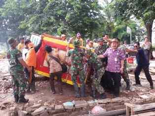 TIGARAKSA - Camat Tigaraksa Mas Yoyon Suryana bersama warga dan Muspika Kecamatan Tigaraksa membersihkan sampah dan ceceran puing-puing bekas bangunan liar, Jumat (8/1/2015). Kegiatan ini merupakan program rutin jumat bersih (Jumsih) Kecamatan Tigaraksa dalam memupuk kebersamaan antara warga dan Muspika.