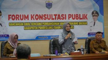 PANDEGLANG, (JT) - Badan Perencanaan Pembangunan Daerah (Bappeda) Kabupateb Pandeglang menggelar Forum Konsultasi Publik (FKP) rancangan awal Rencana Pembangunan Jangka Panjang Daerah (RPJPD) tahun 2024-2045. Bupati Pandeglang Irna Narulita yang membuka acara tersebut berharap rancangan RPJPD menjadi harapan masyarakat Kabupaten Pandeglang.