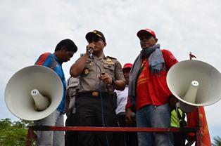 Seperti yang terjadi kali ini saat ratusan buruh sedang berorasi, Kapolres langsung berbaur dengan ratusan buruh. Bahkan ia naik mobil komando yang digunakan orasi buruh tersebut.