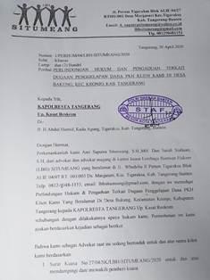 TIGARAKSA, (JT) - Dugaan Penggelapan Dana Program Keluarga Harapan (PKH) di Desa Bakung Kecamatan Kronjo, terjadi sejak 2018 silam. Akibat desakan masyarakat, LBH Situmeang melaporkan kasus ini ke Polres Kota Tangerang, Kamis (29/04/2020).