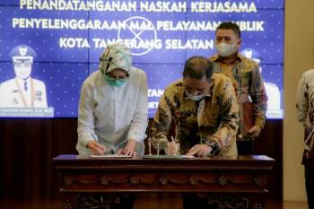 CIPUTAT, (JT) - Sebanyak 17 instansi melakukan penandatanganan komitmen dan kesanggupan untuk mewujudkan penyelenggaraan Mal Pelayanan Publik (MPP) Kota Tangerang Selatan. Penandatanganan disaksikan Deputi Bidang Pelayanan Publik Kementerian Pendayagunaan Aparatur Negara dan Reformasi Birokrasi (Kementerian PAN-RB) Prof. Dr. Diah Natalisa, Walikota Tangerang Selatan Airin Rachmi Diany dan Kepala Dinas Dinas Penanaman Modal Pelayanan Terpadu Satu Pintu (DPMPTSP) Bambang Noertjahjo di Lantai 4 Balaikota Tangsel, Kecamatan Ciputat, Jumat (5/3/2021). Targetnya MPP akan diresmikan 12 April mendatang.