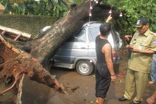 Hujan deras dan angin kencang mengguyur wilayah Pondok Aren, Selasa siang. Lantaran sudah lapuk akibat termakan usia, pohon asem tiba-tiba tumbang diterpa angin dan menimpa mobil yang ada di dekatnya.