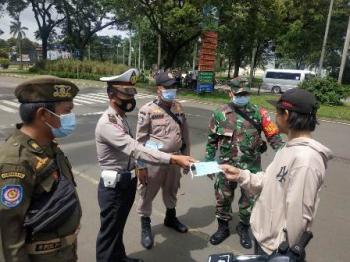 CIKUPA, (JT) - Polresta Tangerang Polda Banten bersama unsur Pemkab Tangerang dan Kodim 0510 Tigaraksa kembali membagikan masker medis kepada masyarakat, Minggu (7/2/2021). Kali ini, jumlah masker medis yang dibagikan sebanyak 20.020 helai yang disebar di 95 titik.