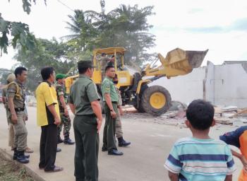 Puluhan bangunan liar tersebut diratakan dengan menggunakan alat berat berupa eskavator. Camat Sukamulya Ahmad Kasori langsung memimpin penertiban.