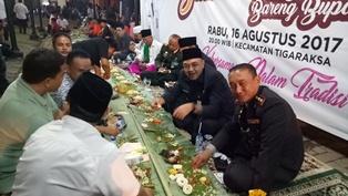 Usai pawai obor bareng pegawai dan warga, Bupati Tangerang Zaki Iskandar, Ketua DPRD Madromli dan Kapolresta Tangerang AKBP Sabilul Alif langsung menggelar makan bersama atau babacakan bareng warga di halaman Kecamatan Tigaraksa.