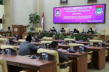 TIGARAKSA, - Dewan Perwakilan Rakyat Daerah (DPRD) Kabupaten Tangerang menggelar rapat paripurna, Senin (9/11/2020). Kali ini agenda rapat tentang Pemandangan Umum fraksi atas Penjelasan Bupati Tentang Nota Keuangan Rancangan APBD Tahun 2021.