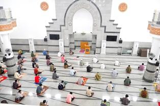Di dalam masjid, semuanya wajib memakai masker yang menutup mulut dan hidung serta membawa perlengkapan sholat sendiri. Jarak antar jamaah