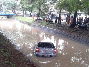 TANGERANG – Kecelakaan mobil tunggal terjadi di Jalan Makam Pahlawan Taruna, Kota Tangerang, Minggu (28/2/2016). Mobil Nisan Grand Livina dengan nomor polisi B 1858 BOO ini masuk ke saluran irigasi yang berada persis di sisi kanan jalan.