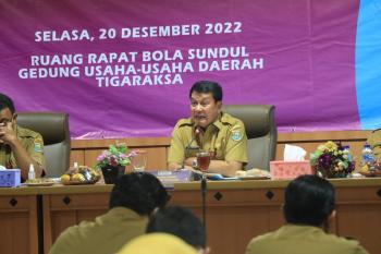 TIGARAKSA, (JT) - Sekretaris Daerah (Sekda) Kabupaten Tangerang Moch Maesyal Rasyid memimpin rapat koordinasi optimalisasi pajak reklame dan pajak lainnya seperti pajak parkir, hiburan, pajak restoran dan retribusi daerah. Acara tersebut dilakukan di Ruang Bola Sundul GUD, Selasa, (20/12/2022).