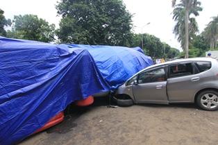 Truk tak dapat dikendalikan, saat membanting kendaraan malah terguling ke kiri dan menghantam honda jazz bernopol B1233NFB yang ada di depan truk. Alhasil, bagian depan honda jazz hancur tertimpa truk. Hingga bagian depan honda jazz metalik itu tak berbentuk. Pengemudi dan dua penumpang luka ringan terkena pecahan kaca.
