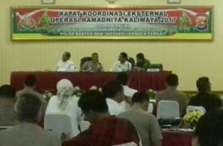 SERANG - Wakapolda Banten Kombes Aan Suhanan memimpin rapat koordinasi eksternal Operasi Ramadaniya Kalimaya 2017 di aula Serba Guna Polda, Rabu (7/6/2017). Rakor ini membahas pengamanan mudik dan arus balik di ruas jalan raya.